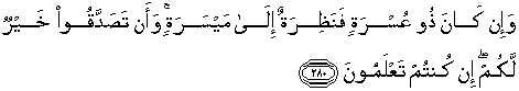 Dan jika orang yang berhutang itu sedang mengalami kesempitan hidup, maka berilah tempoh sehingga ia lapang hidupnya dan (sebaliknya) bahawa kamu sedekahkan hutang itu (kepadanya) adalah lebih baik untuk kamu, kalau kamu mengetahui (pahalanya yang besar yang kamu akan dapati kelak).